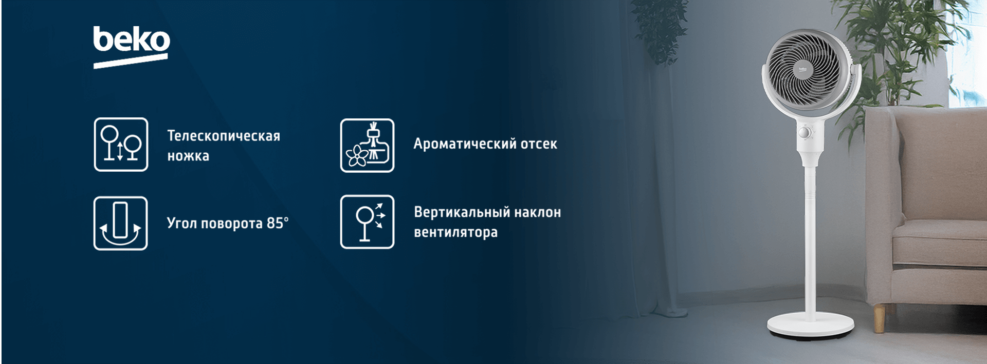 Чтобы в жаркий день охладиться сразу всей семьей или небольшой компанией, устроившись на диване, активируйте функцию осцилляции – автоматический поворот вентилятора на угол 85° и существенное расширение зоны покрытия прохладным воздухом.